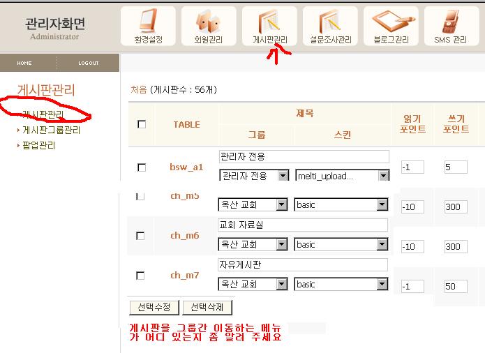 구룹안에 게시판 자체를  다른 그룹으로 이동하는 메뉴가 있는  것이 아니라