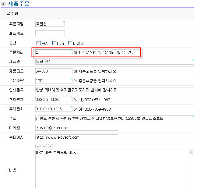 주문처리관련 부분은 관리자로 로그인하신 후 수정버튼을 클릭했을 때만 활성화됩니다.