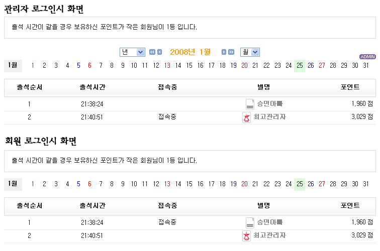 기존 달력은 오늘 출석자만 볼수 있었는데 달력스킨을 접목시켜 해당일에 출석자 순서를