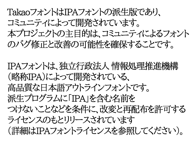 TakaoフォントはIPAフォントの派生版であり、コミュニティによって開発されています。本プロジェクトの主目的は、コミュニティによるフォントのバグ修正と改善の可能性を確保することです。